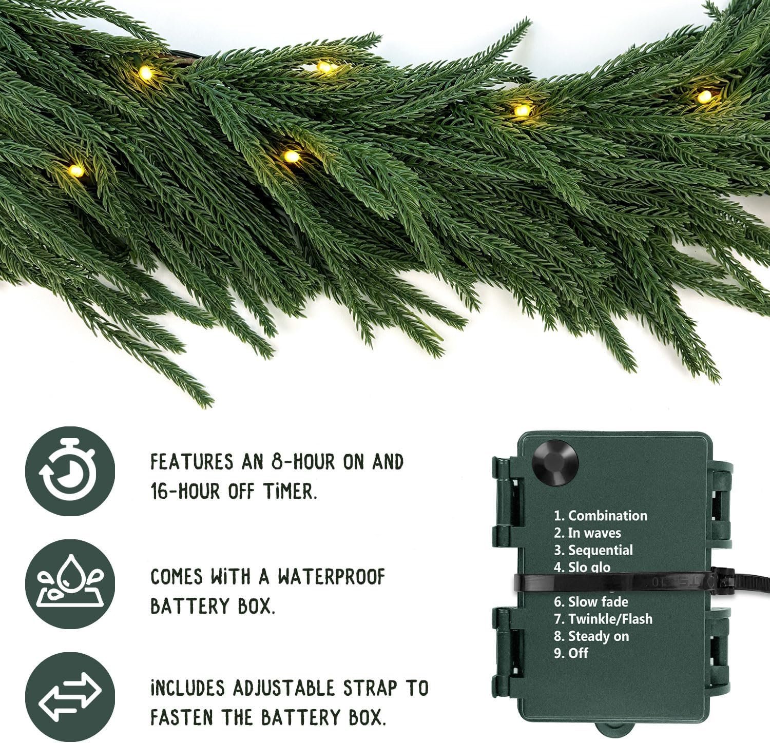 With its realistic pine-branch design and integrated lighting, this garland is the perfect addition to your Christmas decorations, bringing a classic and timeless holiday charm to any space. Whether you prefer a traditional cozy atmosphere or a modern festive style, this versatile piece enhances mantels, staircases, doorways, and even outdoor porches with ease. Designed to be durable and weather-resistant, it offers long-lasting quality, making it an ideal choice for reusable Christmas decorations year after year.